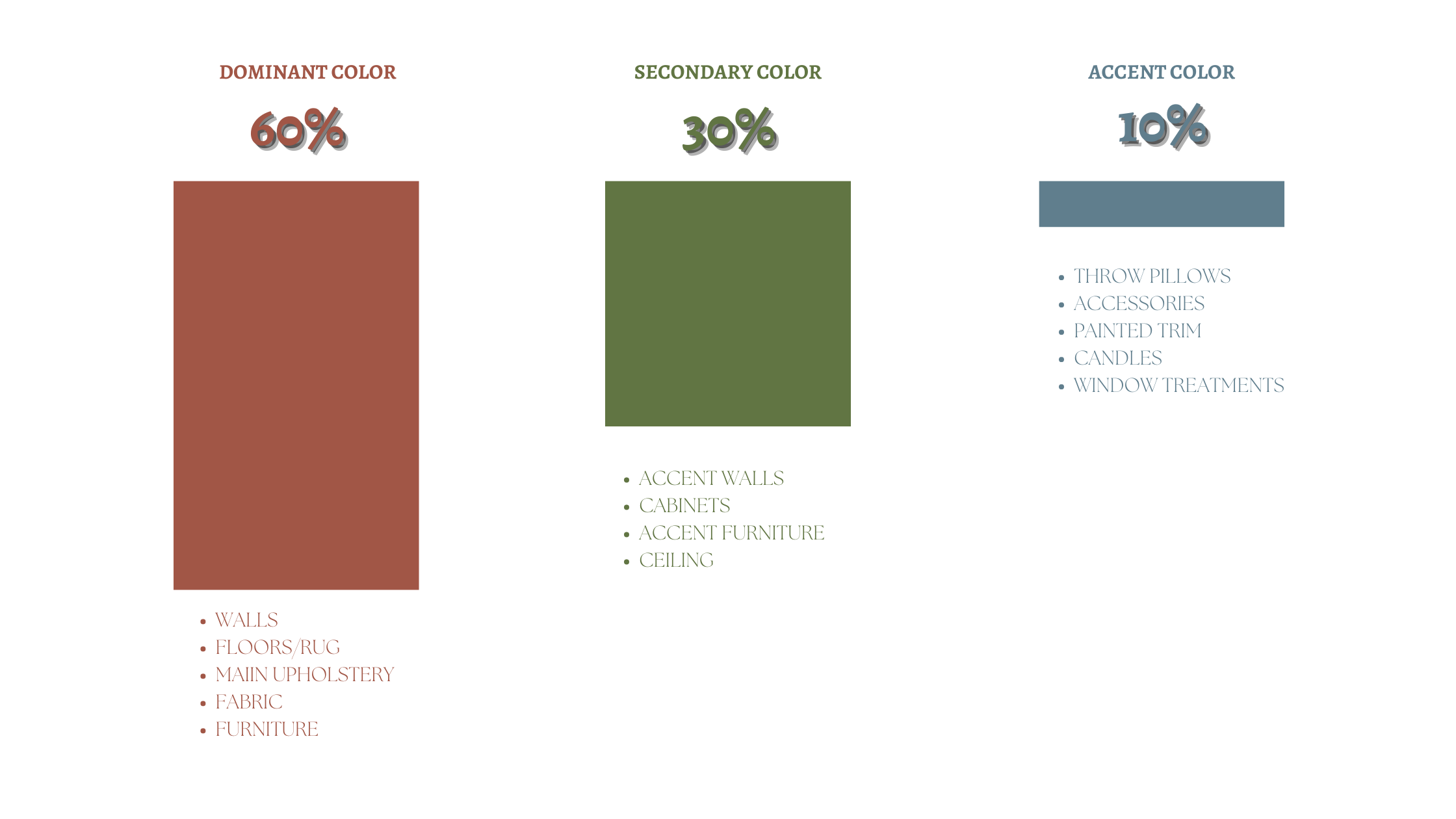 30% Secondary color —Hue, Tint, and Shade in smaller pieces, such as, drapery, painted case goods, side chairs.
