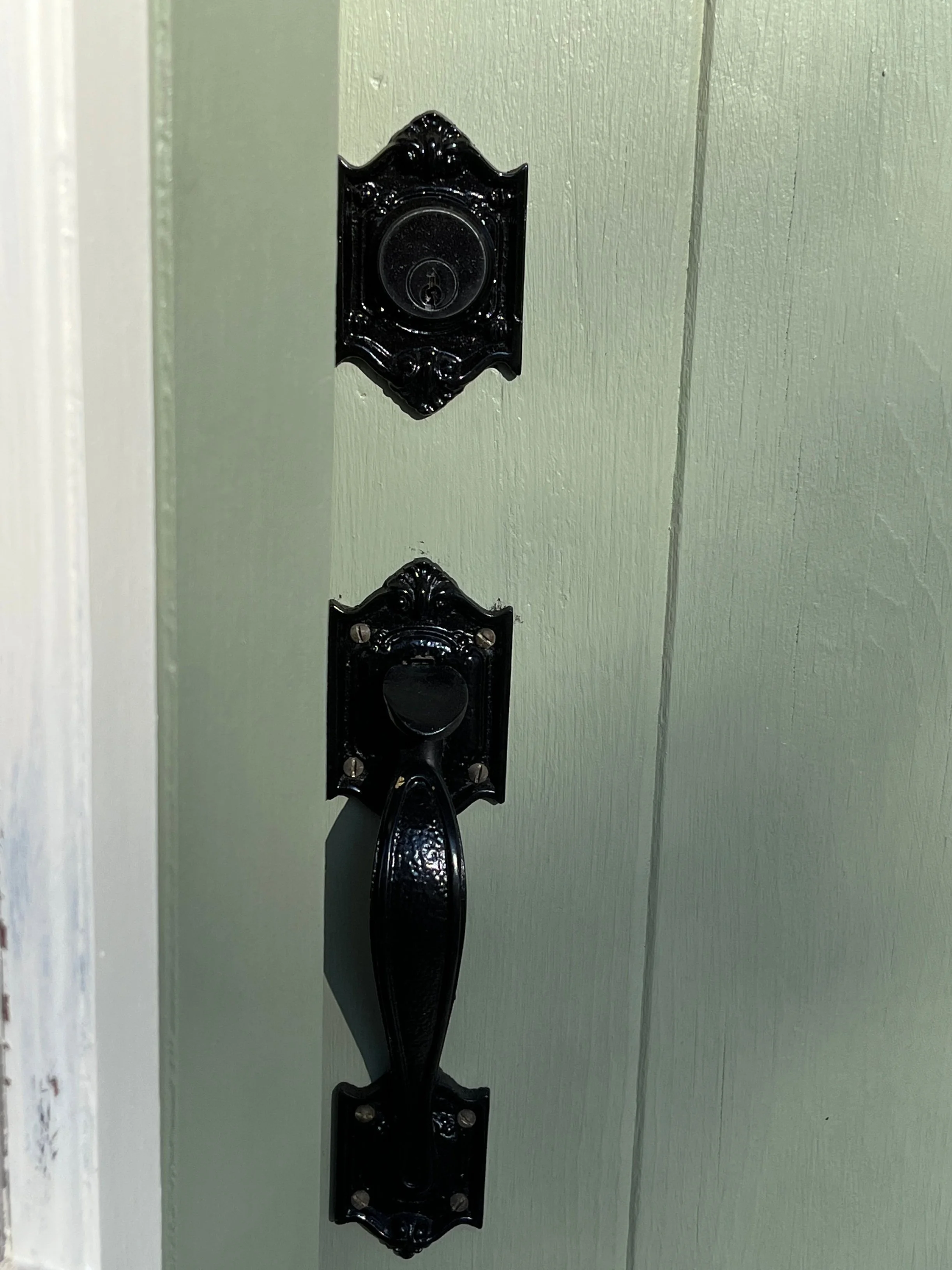 The front door was given a new color, a soft sage green from brown. This creates a more welcoming facade. The arched door included hammered bronze hardware, which will remain. A wooden deck railing was painted cream to blend with the window trim instead of the house. The bit of contrast provided makes the entrance more of a feature. This little mini-makeover to the entrance welcomes in those who just pop in for a bit.